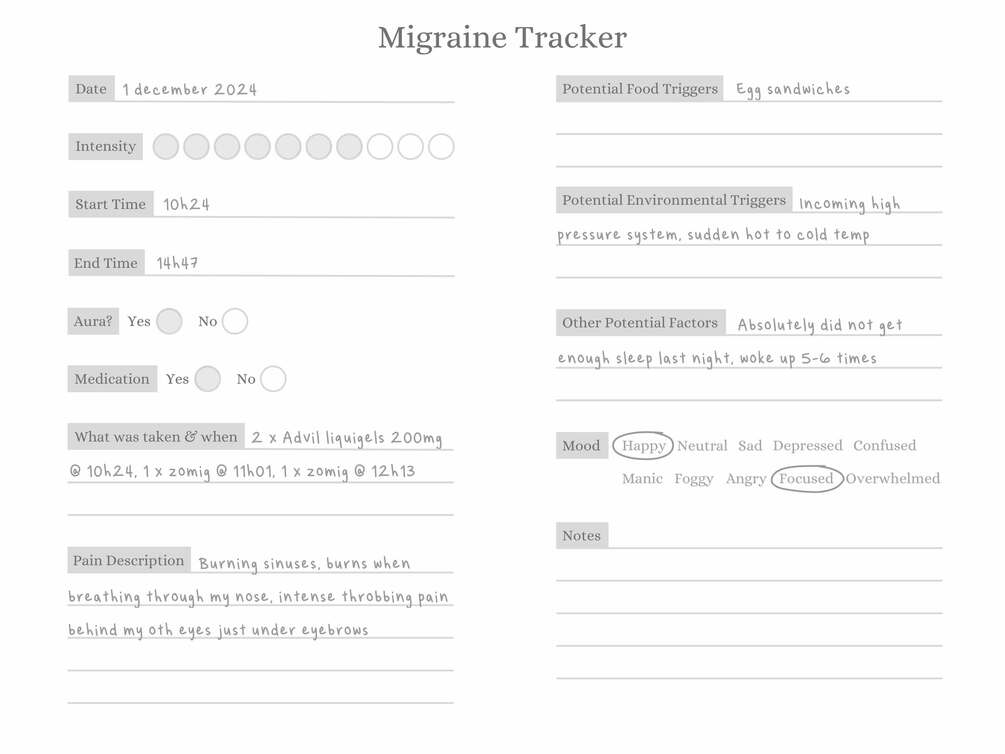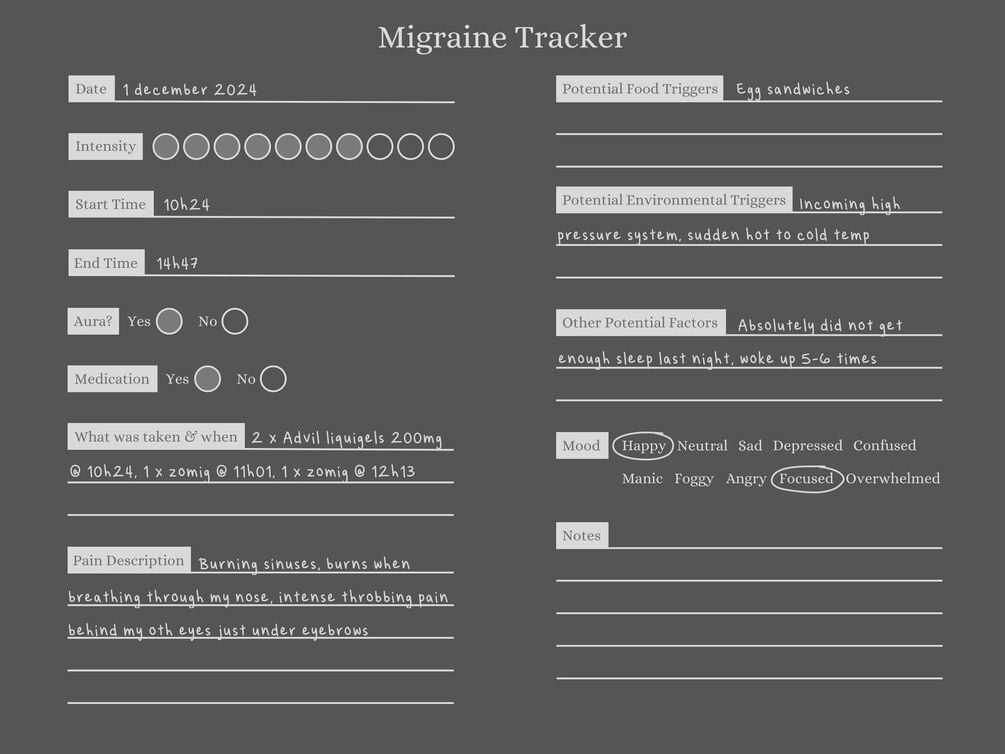 I wasn't able to find a proper migraine tracker that looked the way I wanted and tracked the things I wanted, so I made one for myself and decided to share!
