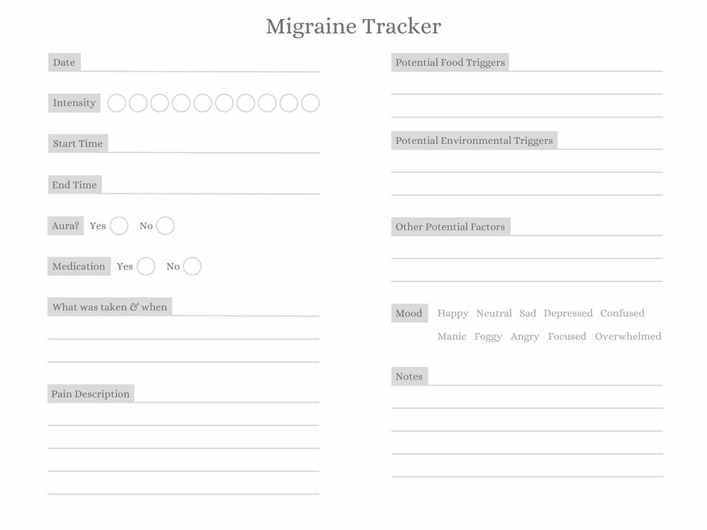 Migraine tracker PDF, 2 pages: 1 page light, 1 page dark